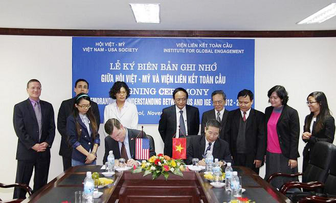 The signing of the Memorandum of Understanding of cooperation between the Vietnam-USA Society and the Institute for Global Engagement (IGE).