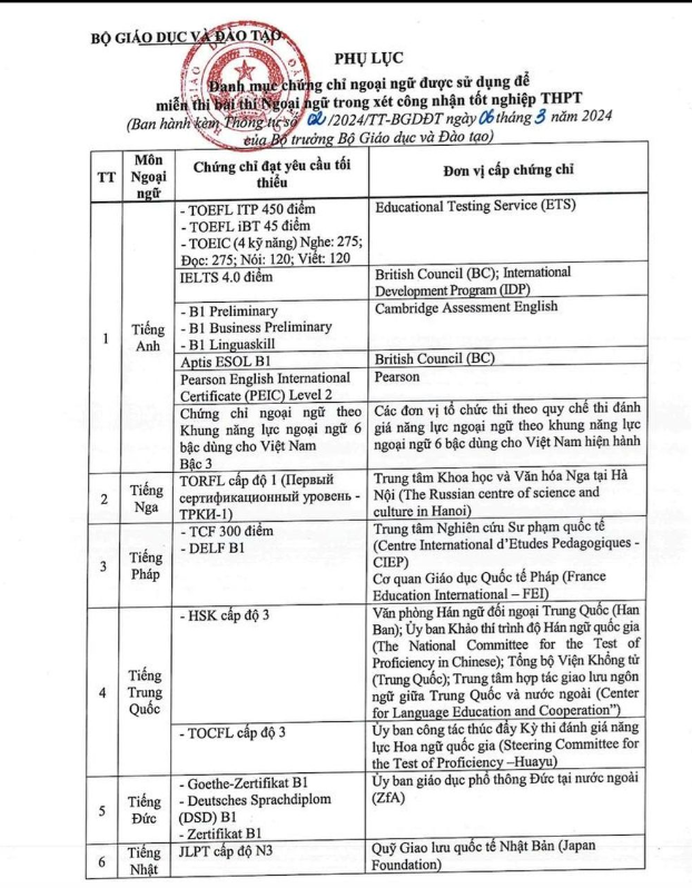TCVM - Bộ Giáo dục và Đào tạo đã ban hành danh mục chứng chỉ ngoại ngữ được sử dụng để miễn bài thi Ngoại ngữ trong xét tốt nghiệp Trung học Phổ thông năm 2024.