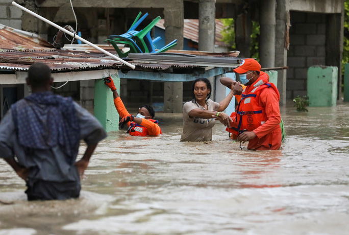Lực lượng cứu hộ đưa người dân đi sơ tán khi bão Laura đổ bộ tỉnh Azua - Cộng hòa Dominica hôm 23-8 Ảnh: REUTERS