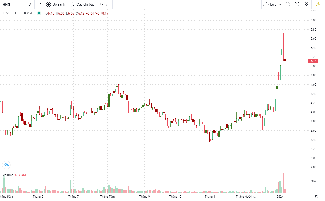 Trước thông tin bán vốn của Hoàng Anh Gia Lai, giá cổ phiếu HNG trên sàn chứng khoán bất ngờ tăng trần liên tục trong 6 phiên liền với tổng mức tăng 45%. Còn so với mức giá thấp nhất 3.300 đồng/CP vào đầu tháng 11/2023, thị giá cổ phiếu HNG hiện đã tăng gấp 2 lần trong vòng 2 tháng qua.
