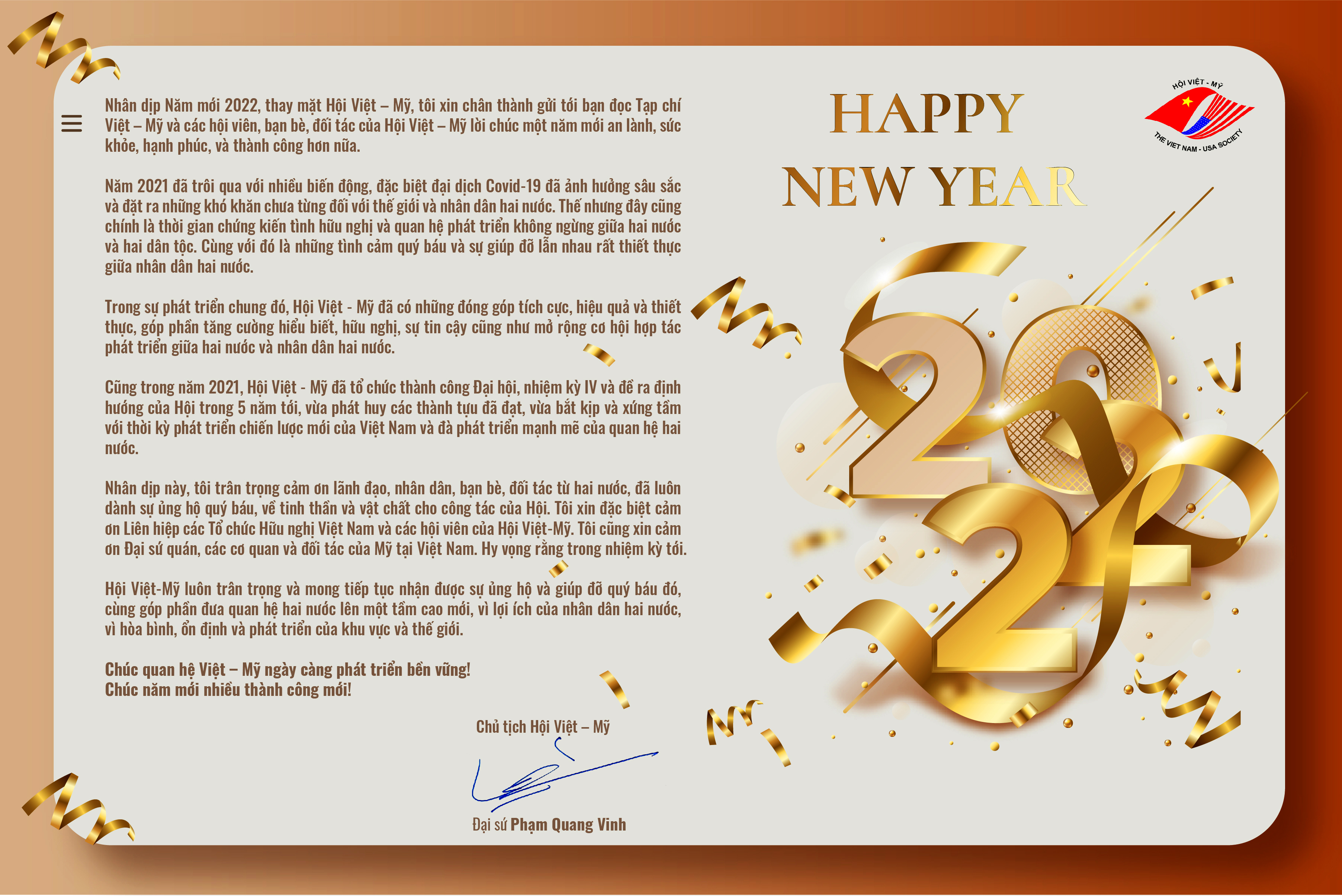 TCVM - Nhân dịp Năm mới 2022, Chủ tịch Hội Việt – Mỹ gửi thư chúc mừng năm mới tới bạn đọc Tạp chí Việt - Mỹ; các hội viên và đối tác của Hội Việt - Mỹ với lời chúc một năm mới an lành, hạnh phúc và thành công trong cuộc sống, sự nghiệp.