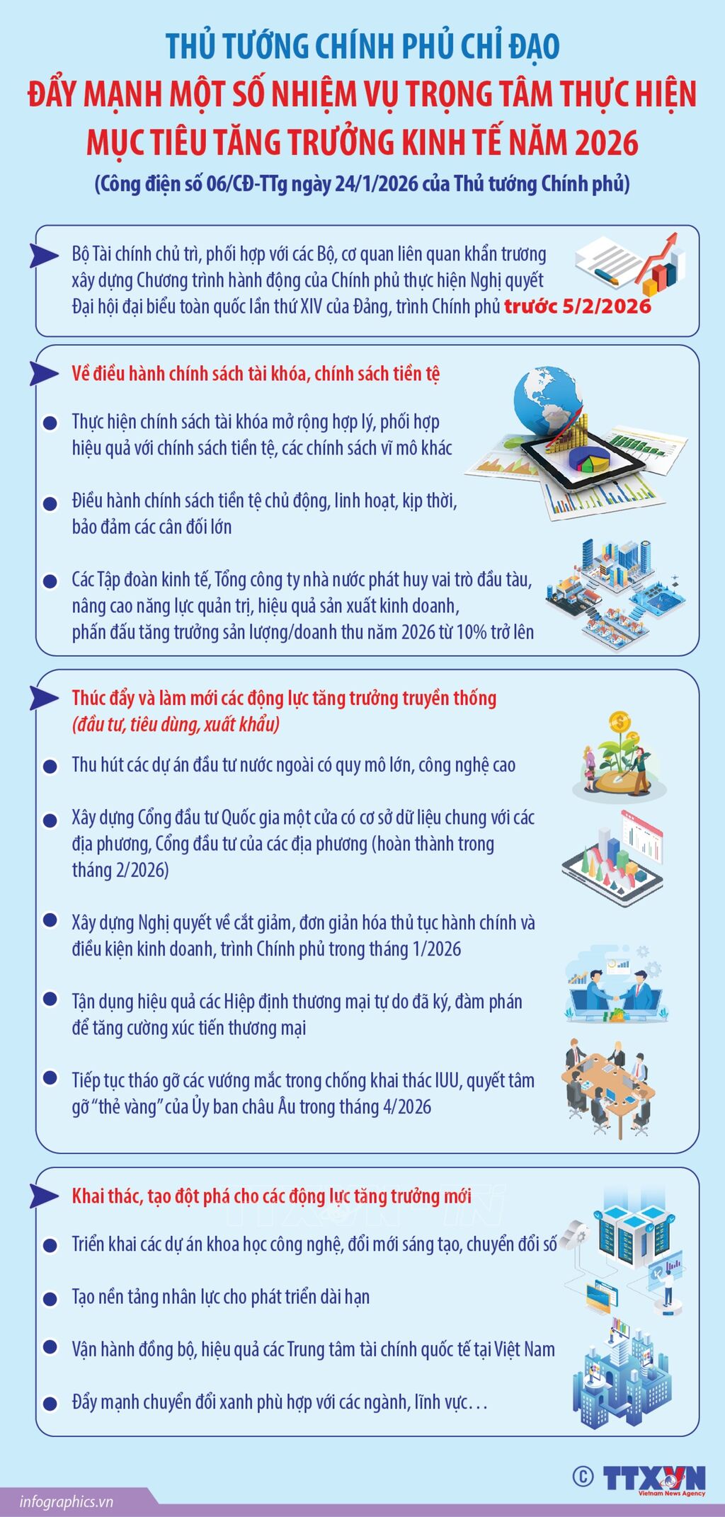 Năm 2026 được xác định là năm có ý nghĩa đặc biệt quan trọng, đặt nền móng cho việc thực hiện thắng lợi Nghị quyết Đại hội đại biểu toàn quốc lần thứ XIV của Đảng. Trước bối cảnh tình hình quốc tế và trong nước tiếp tục diễn biến nhanh, phức tạp và khó lường, Thủ tướng Chính phủ yêu cầu các bộ, cơ quan, địa phương, tập đoàn, tổng công ty chủ động nắm chắc tình hình, nâng cao năng lực phân tích, dự báo, điều hành chính sách linh hoạt, kịp thời và hiệu quả, không để bị động, bất ngờ. Trọng tâm là triển khai quyết liệt các nhiệm vụ, giải pháp đã đề ra tại Nghị quyết số 01/NQ-CP của Chính phủ, đồng thời tập trung vào các động lực then chốt để thúc đẩy tăng trưởng.