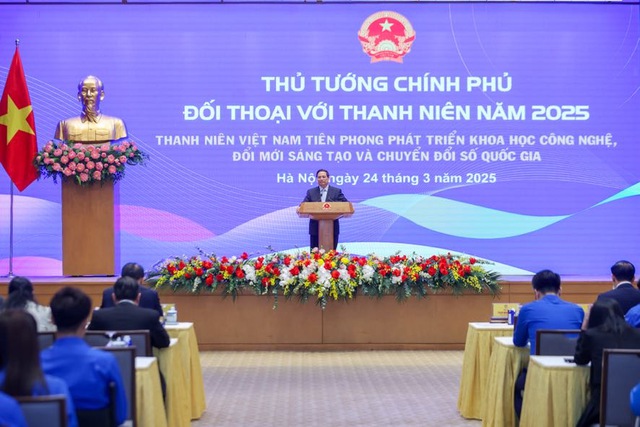 TCVM - Theo thông cáo báo chí của Văn phòng Chính phủ, chiều 24/3, tại trụ sở Chính phủ, Thủ tướng đối thoại với thanh niên Việt Nam năm 2025 với chủ đề "Thanh niên Việt Nam tiên phong phát triển khoa học công nghệ, đổi mới sáng tạo và chuyển đổi số quốc gia".