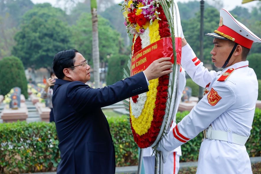 Thủ tướng Phạm Minh Chính và đoàn công tác dâng hương tưởng nhớ các Anh hùng, liệt sĩ tại Nghĩa trang liệt sĩ quốc gia A1 - Ảnh: VGP/Nhật Bắc