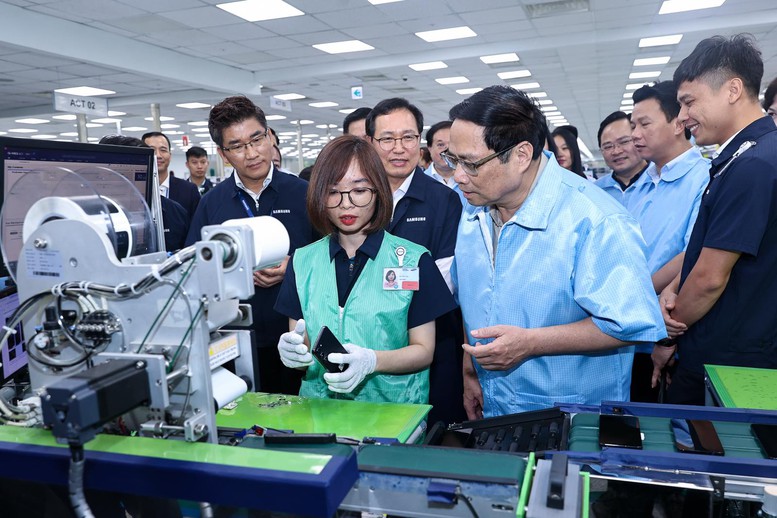 Thủ tướng Phạm Minh Chính thăm dây chuyền sản xuất thiết bị điện tử của Công ty TNHH Samsung Electronics Việt Nam tháng 7/2023 - Ảnh VGP/Nhật Bắc