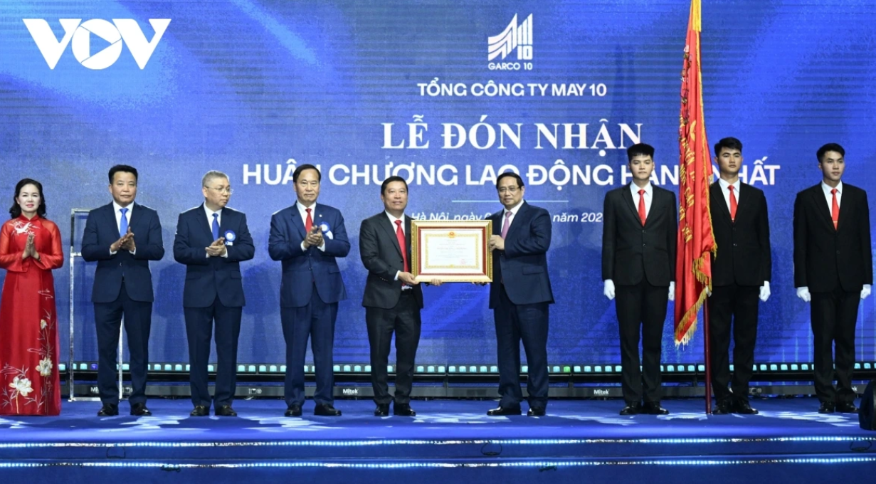 Thay mặt lãnh đạo Đảng và Nhà nước, Thủ tướng Phạm Minh Chính đã trao tặng Huân chương Lao động hạng Nhất cho tập thể Tổng công ty May 10, ghi nhận và biểu dương những thành tựu rất đáng tự hào mà các thế hệ người thợ May 10 đã bền bỉ gây dựng trong suốt 80 năm qua (Ảnh: VOV.vn)