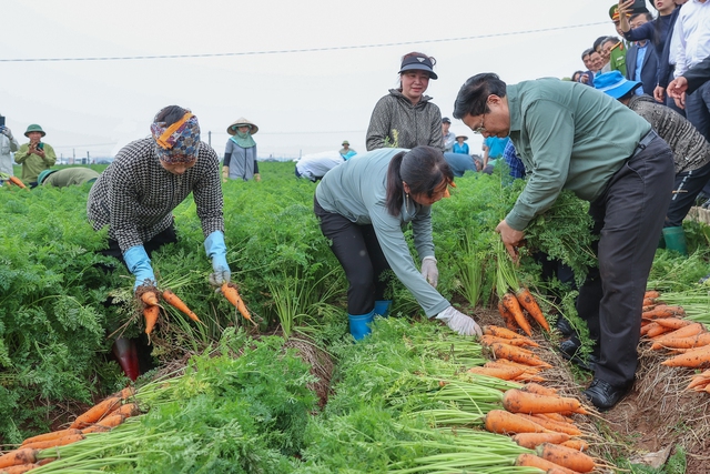 Sau khi nghe báo cáo về tình hình sản xuất và tiêu thụ cà rốt, Thủ tướng Phạm Minh Chính đã thu hoạch cà rốt cùng nông dân và nói chuyện, động viên tại khu vực thu hoạch cà rốt.