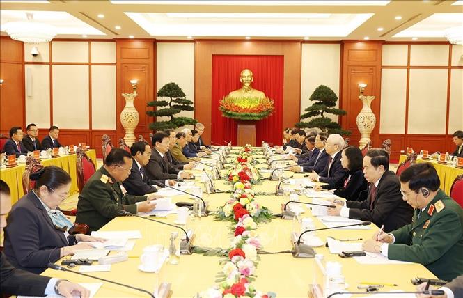Cuộc gặp cấp cao giữa Đảng Cộng sản Việt Nam và Đảng Nhân dân Cách mạng Lào do Tổng Bí thư Nguyễn Phú Trọng và Tổng Bí thư, Chủ tịch nước Lào Thongloun Sisoulith đồng chủ trì. Ảnh: TTXVN