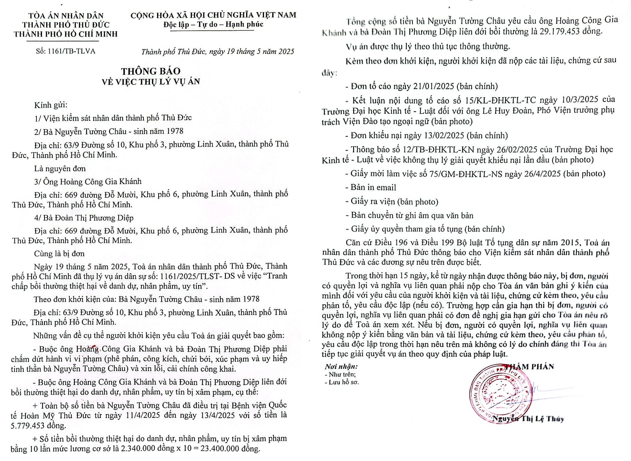 Ngày 19/5, Toà án Nhân dân Thành phố Thủ Đức – Thành phố Hồ Chí Minh có thông báo về việc thụ lý vụ án dân sự số 1161/2025/TLST – DS về việc “tranh chấp bồi thường thiệt hại về danh dự, nhân phẩm, uy tín”.