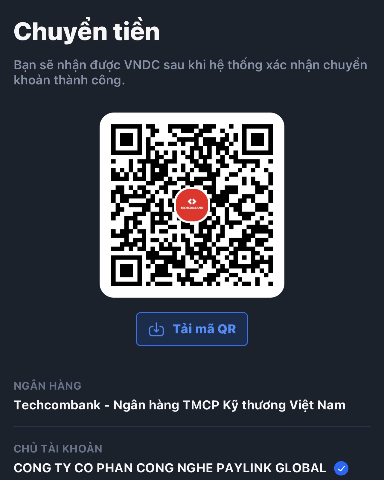 Để nạp VNDC, người dùng có thể nạp trực tiếp thông qua tài khoản ngân hàng của Công ty Cổ phần Công nghệ PayLink Global.