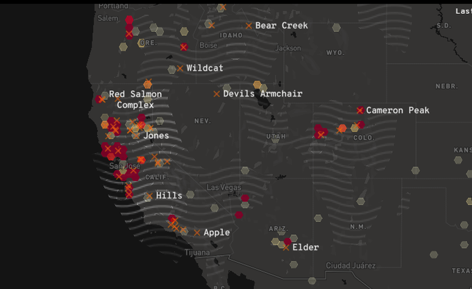 Các cụm đám cháy ở California hôm 19/8. Ảnh: Latin Times