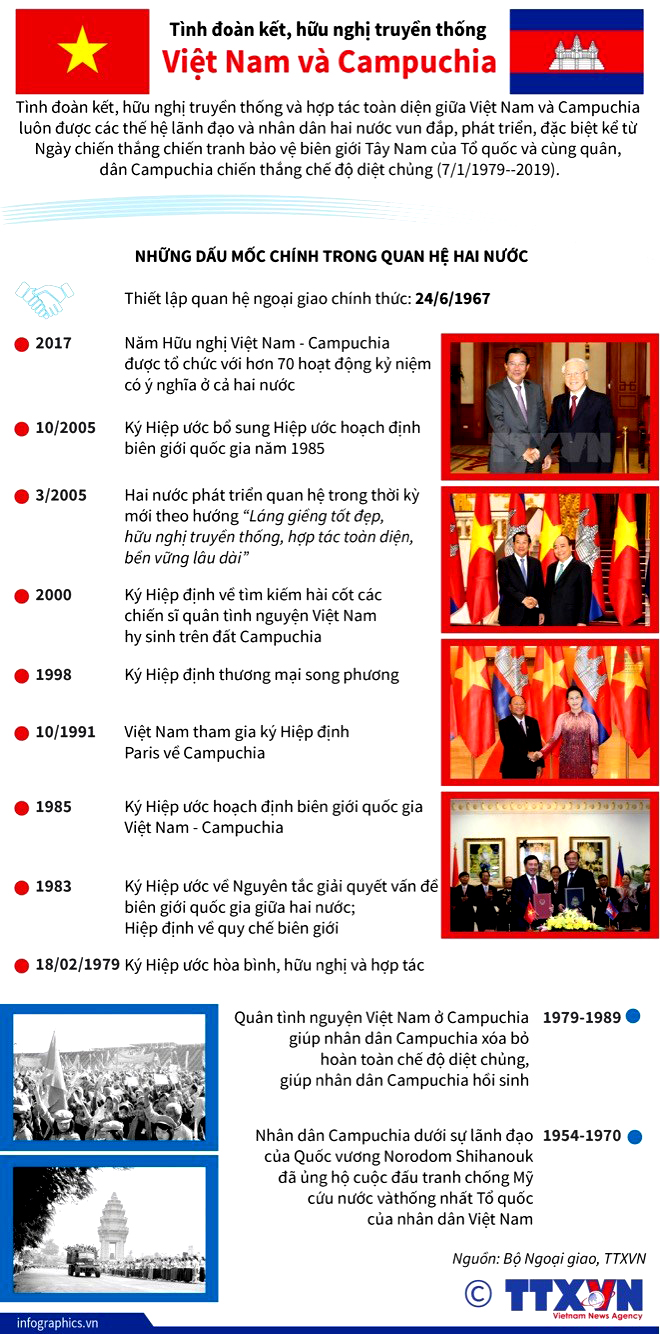 TCVM - Tình đoàn kết, hữu nghị truyền thống và hợp tác toàn diện giữa Việt Nam và Campuchia luôn được các thế hệ lãnh đạo và nhân dân hai nước vun đắp, phát triển, đặc biệt kể từ Ngày chiến thắng chiến tranh bảo vệ biên giới Tây Nam của Tổ quốc và cùng quân, dân Campuchia chiến thắng chế độ diệt chủng (7/1/1979-7/1/2019).