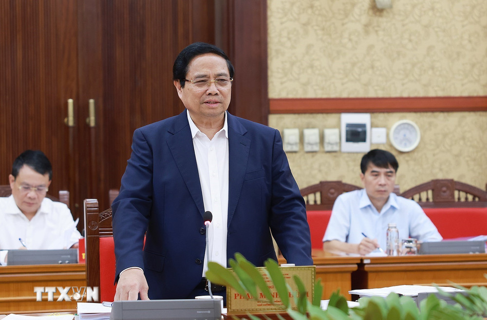 Thủ tướng Phạm Minh Chính phát biểu tại buổi làm việc với Ban Thường vụ Tỉnh ủy Tây Ninh. (Ảnh: TTXVN/Dương Giang)