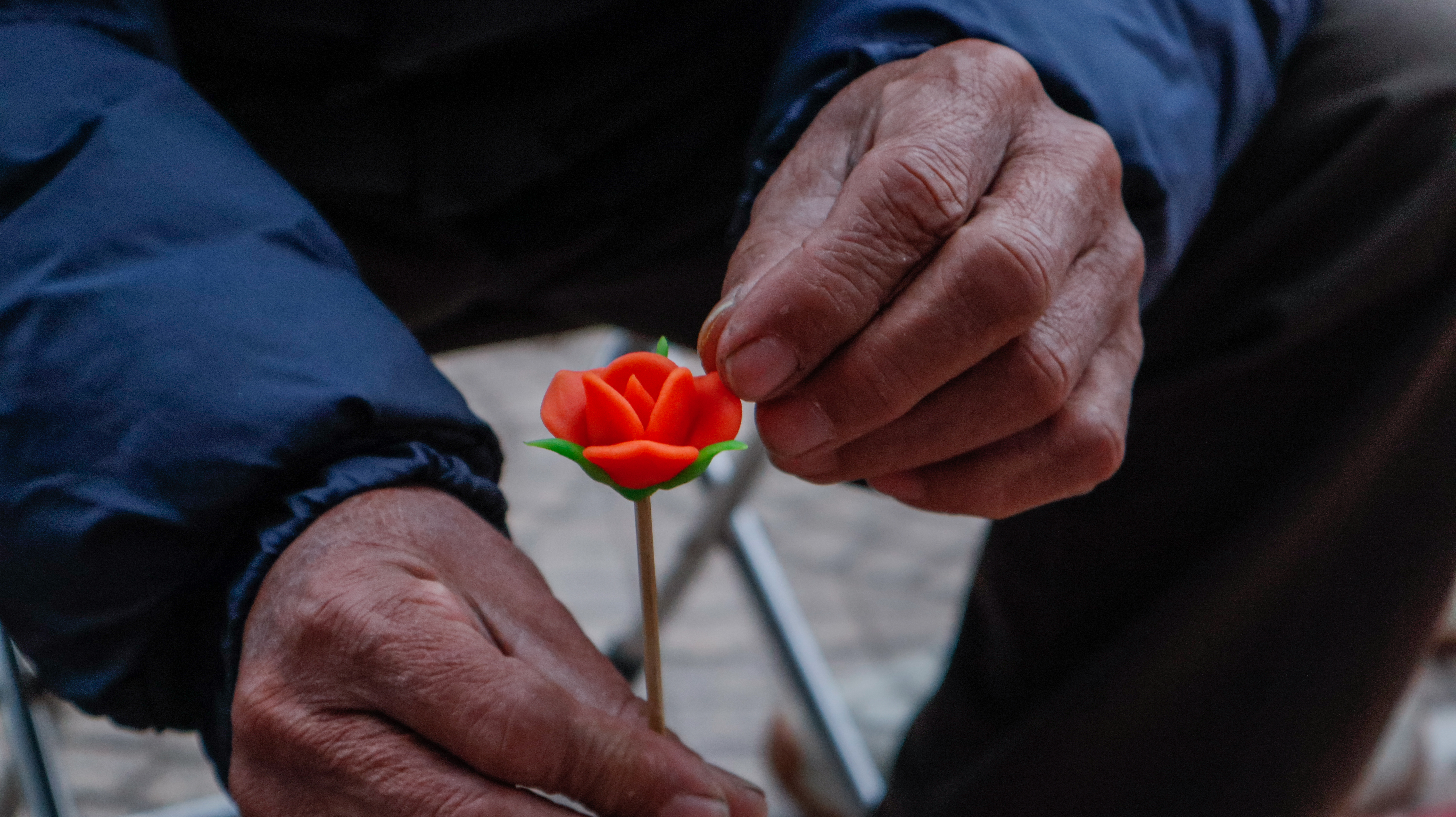 Ông Đĩnh tỉ mỉ dạy khách hàng cách nặn bông hoa hồng. Ảnh: Đăng Khôi