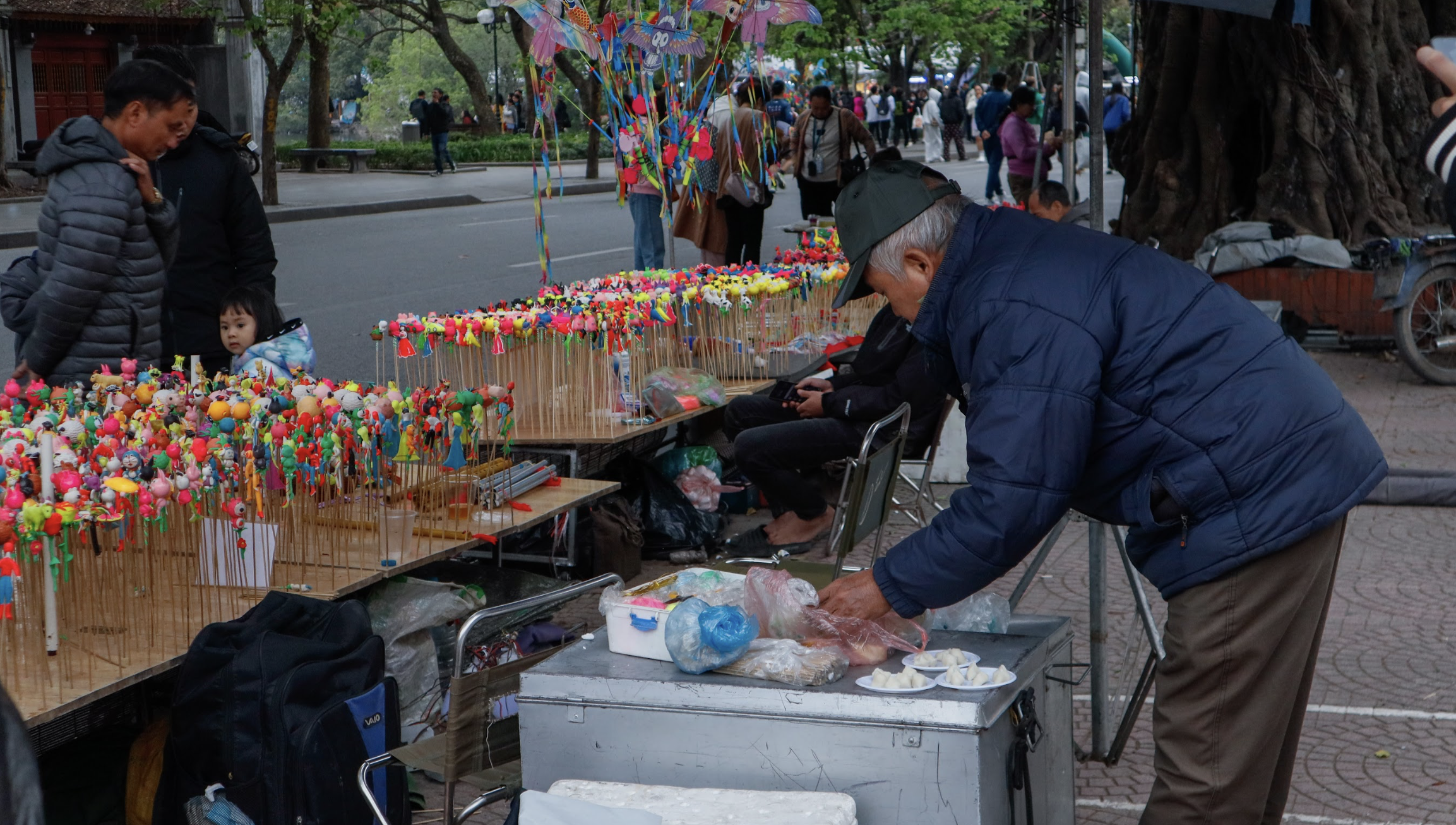 Ông Đĩnh bận rộn chuẩn bị cho sạp hàng tò he trên phố đi bộ. Ảnh: Đăng Khôi