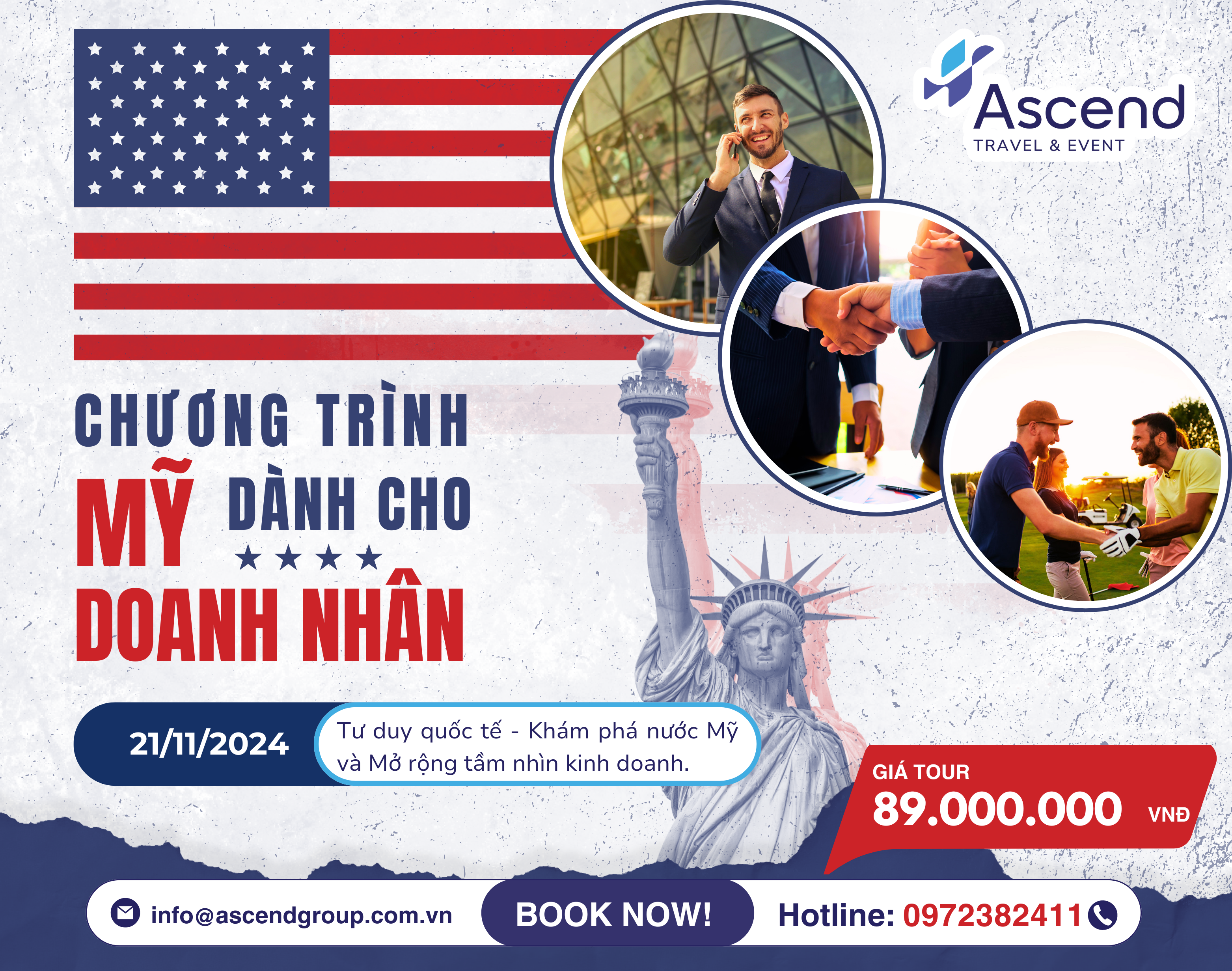 Hãy tham gia ngay chương trình đặc biệt của Ascend Travel and Event ngày 21/11/2024 (khởi hành từ Hà Nội/Đà Nẵng/TP.Hồ Chí Minh) để nắm bắt những cơ hội kinh doanh toàn cầu và khám phá các điểm đến du lịch nổi tiếng tại Mỹ.
