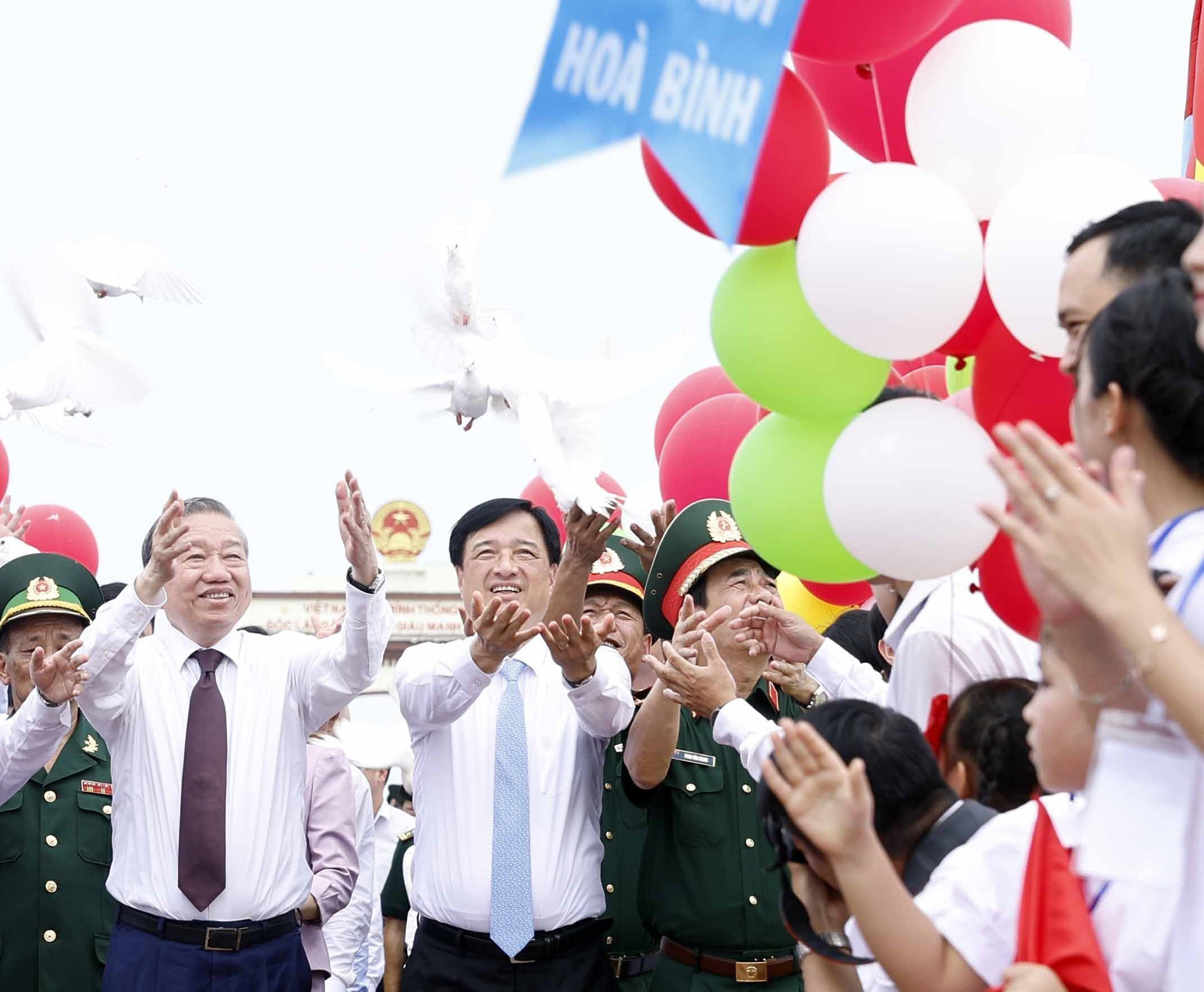 Tổng Bí thư, Chủ tịch nước Tô Lâm và các đại biểu thả chim bồ câu trên cầu Hiền Lương - Ảnh: TTXVN