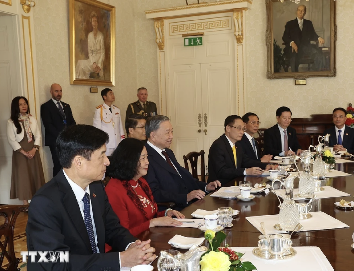 Tổng Bí thư, Chủ tịch nước Tô Lâm cảm ơn Tổng thống Michael Higgins về sự đón tiếp trọng thị và nồng hậu dành cho Đoàn đại biểu cấp cao Việt Nam, khẳng định Việt Nam coi trọng phát triển quan hệ hữu nghị và hợp tác nhiều mặt với Ireland; đánh giá cao việc Chính phủ Ireland đã dành cho Việt Nam vị trí ưu tiên trong chính sách hợp tác phát triển trong khuôn khổ chiến lược “Ireland toàn cầu: Triển khai hoạt động ở khu vực châu Á-Thái Bình Dương đến năm 2025.”