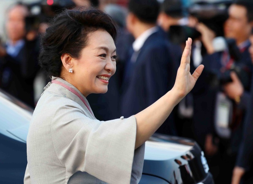 Giáo sư Bành Lệ Viên, Phu nhân Tổng Bí thư, Chủ tịch nước Trung Quốc Tập Cận Bình vẫy chào các đại biểu ra tiễn tại Sân bay Quốc tế Nội Bài. (Ảnh: Phạm Kiên/TTXVN)