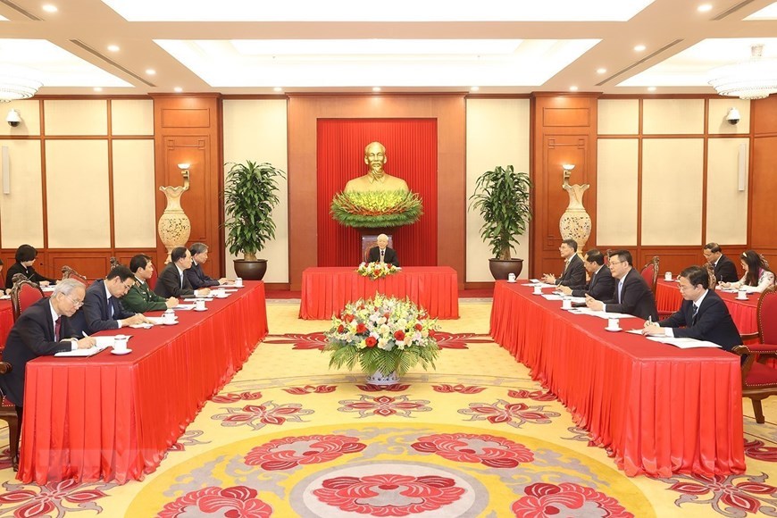 Toàn cảnh buổi điện đàm giữa Tổng bí thư Nguyễn Phú Trọng với Tổng thống Mỹ Joe Biden ngày 29/3 tại Trụ sở Trung ương Đảng ở Hà Nội. Ảnh: TTXVN