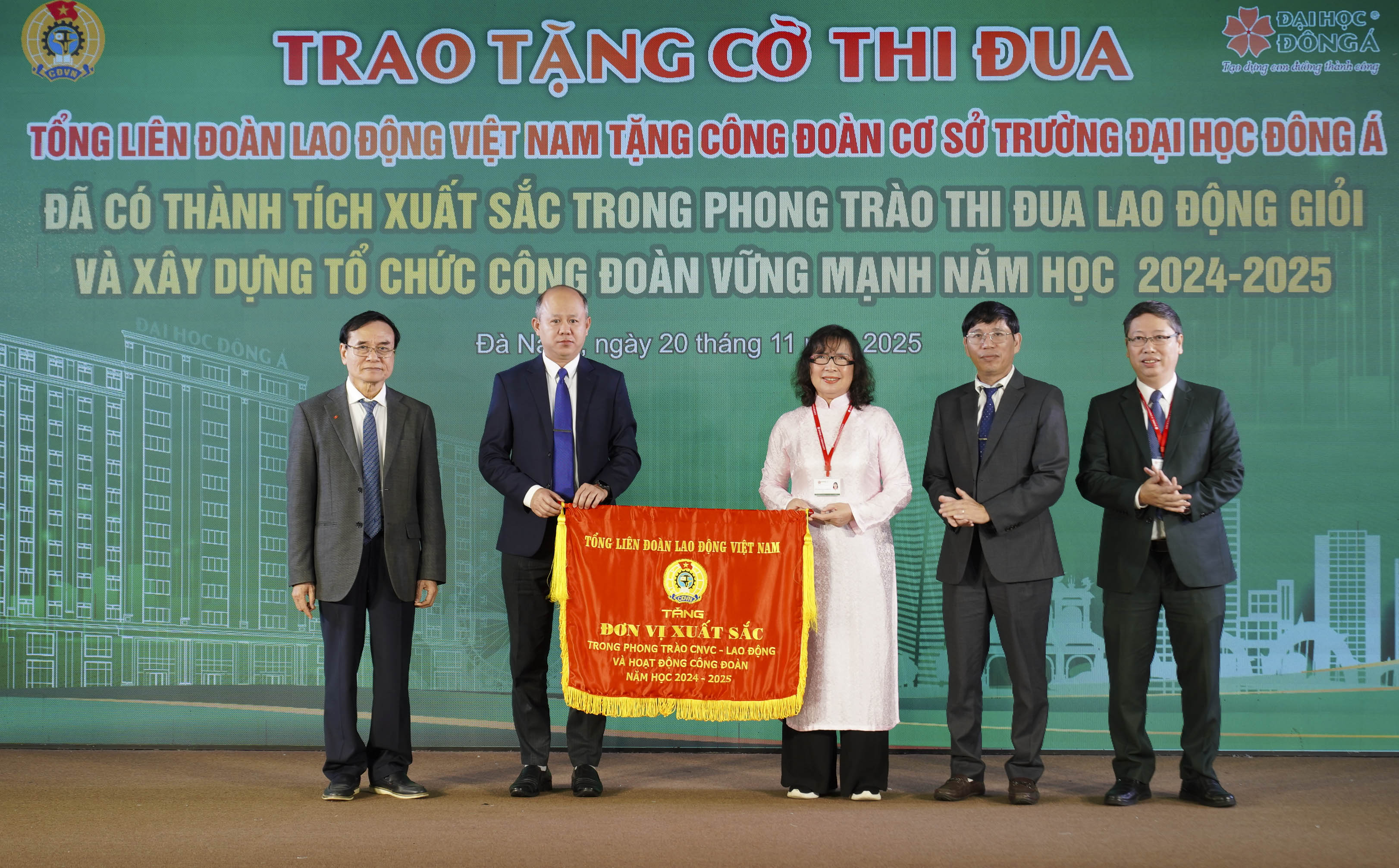 Tại chương trình, Đại học Đông Á đã đón nhận Cờ thi đua của Tổng Liên đoàn lao động Việt Nam cho đơn vị có thành tích xuất sắc trong phong trào thi đua lao động giỏi và xây dựng tổ chức Công đoàn vững mạnh năm học 2024-2025.