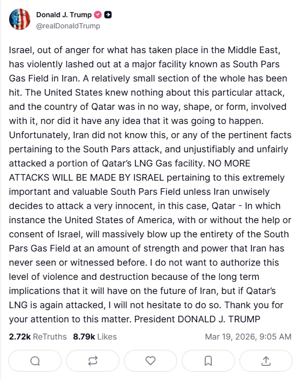 Tối ngày 19/03 (theo giờ Việt Nam), Tổng thống Donald Trump tuyên bố Israel sẽ không tiếp tục tấn công mỏ khí Nam Pars tại Iran trừ khi bị khiêu khích. Tuy nhiên, ông cũng đưa ra lời đe dọa sẽ "thổi bay hoàn toàn" toàn bộ mỏ khí này nếu Iran không chấm dứt các cuộc tấn công nhắm vào Qatar