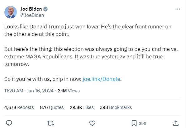 TCVM- Sau chiến thắng áp đảo của cựu Tổng thống Donald Trump ở bang Iowa, Tổng thống đương nhiệm cũng có dòng trạng thái trên mạng xã hội X.