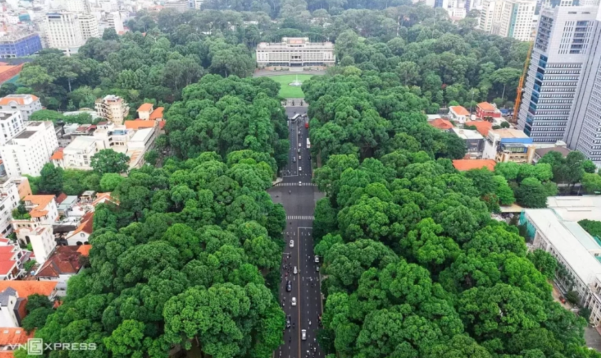 Công viên 30/4 nhiều cây xanh, ở giữa là đường Lê Duẩn, toà nhà phía xa là Dinh Độc Lập. Ảnh: Quỳnh Trần