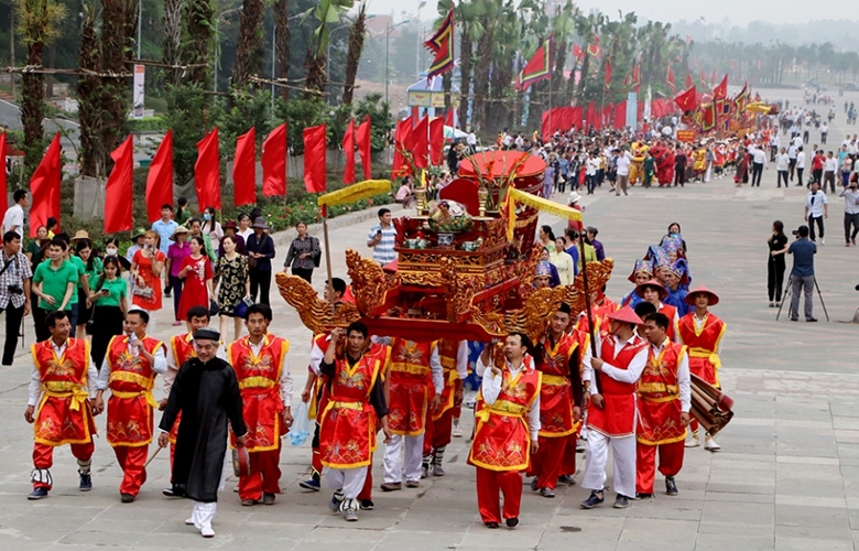 Nghi lễ rước kiệu về Đền Hùng trong dịp Giỗ Tổ Hùng Vương - Lễ hội Đền Hùng là nghi lễ truyền thống được các xã vùng ven di tích duy trì, bảo tồn hàng ngàn năm nay. Ảnh: CPV