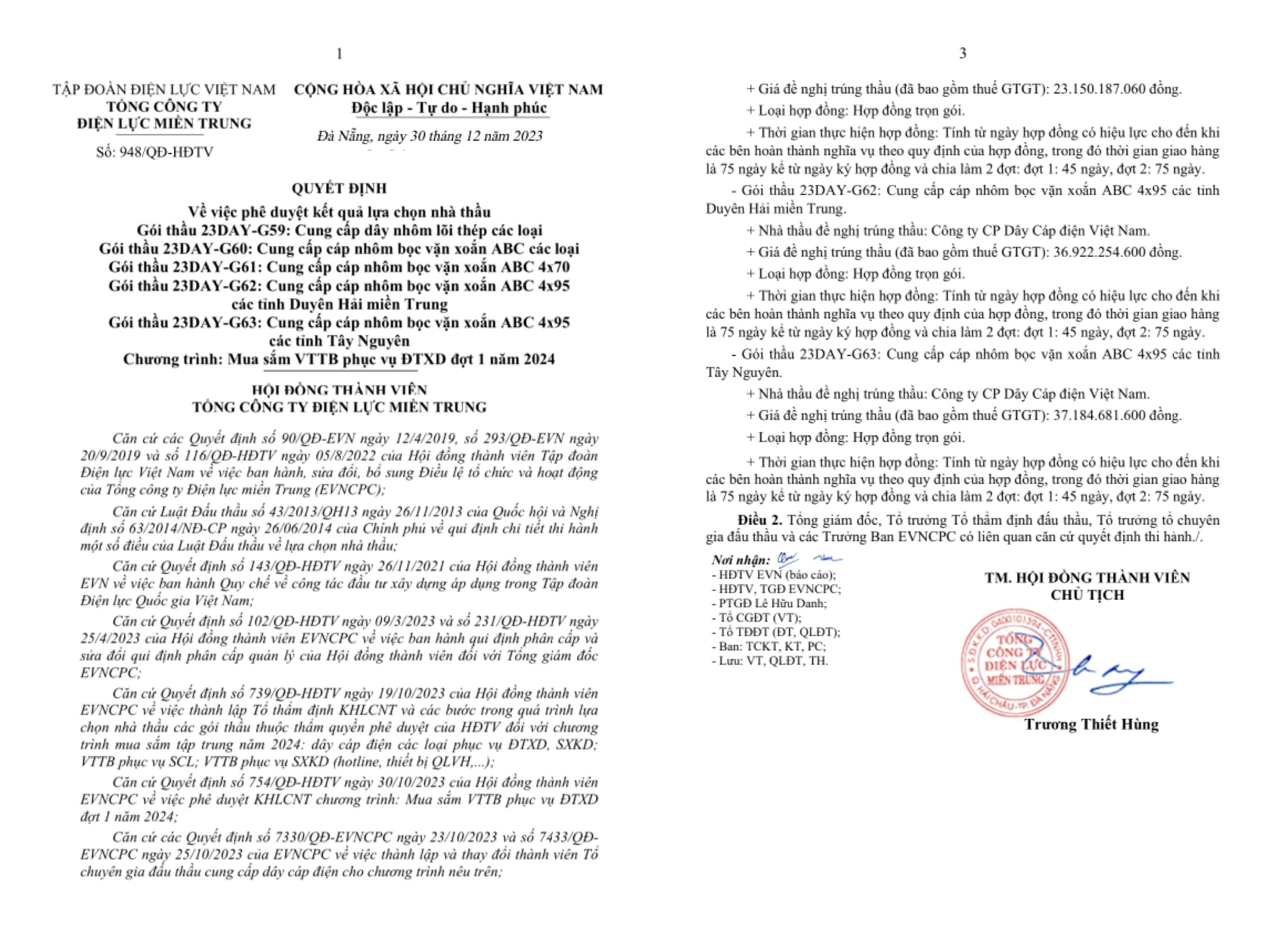 Cũng trong ngày 6/2/2024, Chủ tịch HĐTV Tổng công ty điện lực Miền Trung, Tập đoàn Điện lực Việt Nam Trương Thiết Hùng ký quyết định lựa chọn nhà thầu tại Gói thầu 23DAY-G68: Cung cấp cáp nhôm bọc xoắn ABC các loại, thuộc Chương trình mua sắm VTTB phục vụ SCL, SXKD đợt 1 năm 2024 cho CADIVI. Nhà thầu trúng thầu với giá trúng thầu hơn 34,8 tỷ đồng; giá gói thầu hơn 43,2 tỷ đồng.