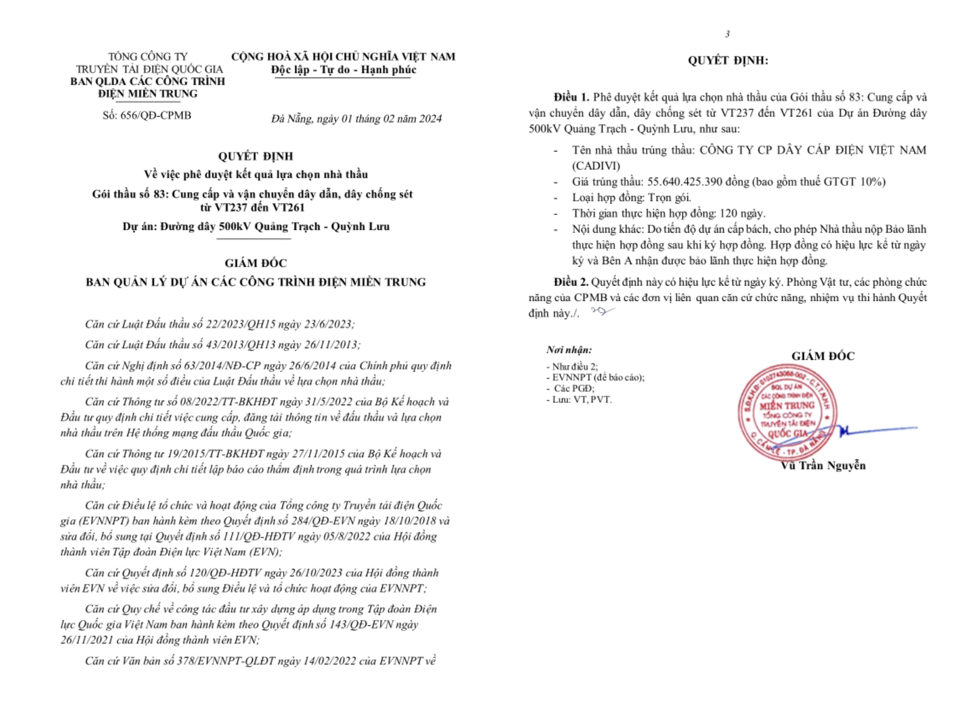Cụ thể, tại Gói thầu số 86 – Cung cấp và vận chuyển dây dẫn, dây chống sét từ VT319 đến VT349, thuộc Dự án đường dây 500kV Quảng Trạch – Quỳnh Lưu, Giám đốc BQL Dự án các công trình điện Miền Trung, Tổng công ty Truyền tải điện Quốc gia Vũ Trần Nguyễn ký quyết định phê duyệt chọn nhà thầu cho nhà thầu trúng thầu là CADIVI. Đơn vị này trúng thầu với giá trúng thầu hơn 51,5 tỷ đồng, giá dự toán gói thầu hơn 54,8 tỷ đồng.