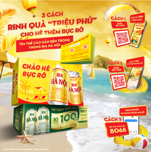 Đơn giản, nhanh gọn, và rất nhiều quà! Mua thùng 24 lon 330ml Bia Hà Nội, tìm thẻ cào và gửi mã dự thưởng là rinh quà liền tay! Chương trình “Chào Hè Rực Rỡ” đã chính thức bùng nổ, sẵn sàng trao tận tay bạn 100 triệu đồng tiền mặt cùng hàng trăm nghìn phần quà hấp dẫn.