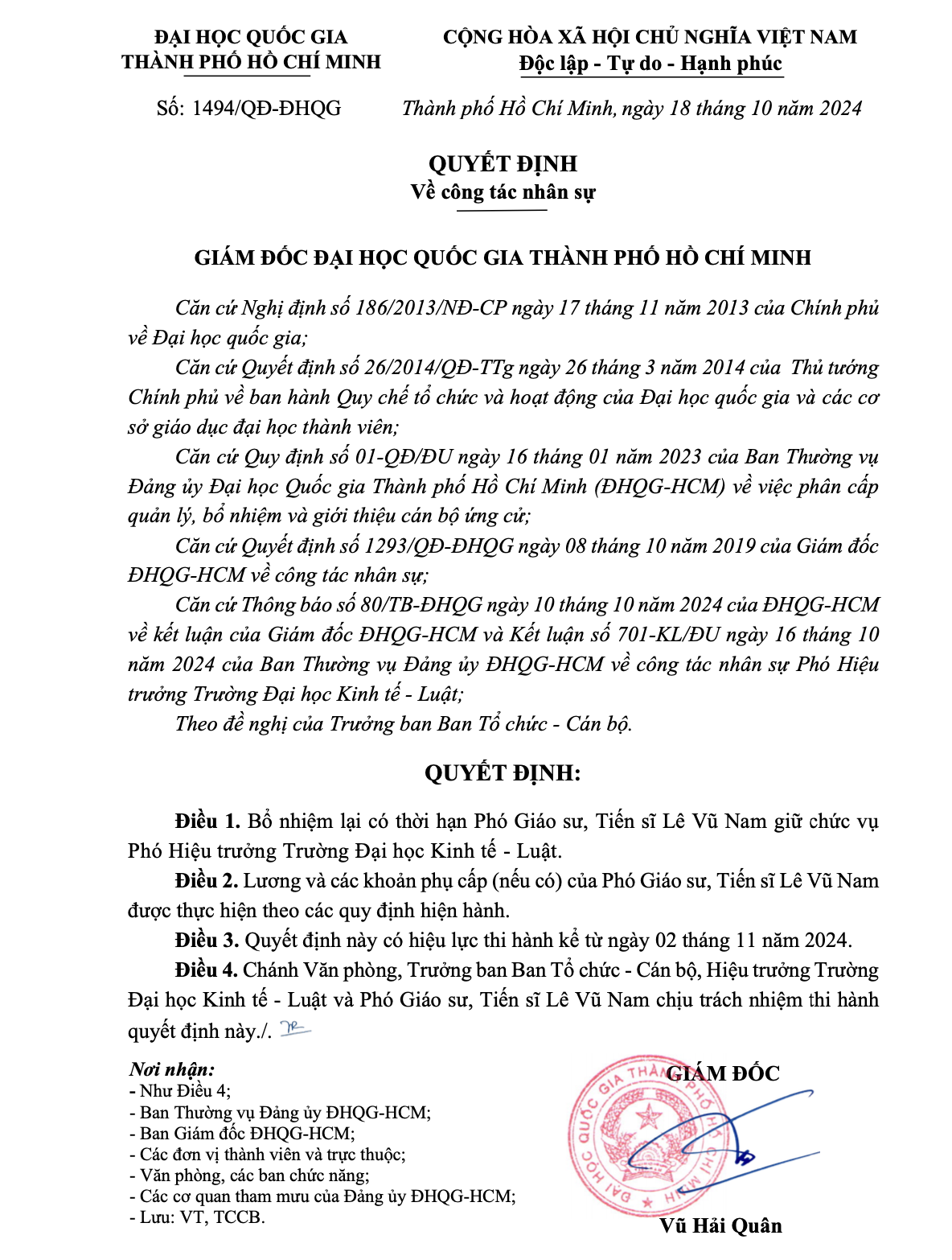 Thông tin trên website trường Đại học Kinh tế - Luật, Đại học Quốc gia Thành phồ Hồ Chí Minh cho biết, ngày 24/10/2024, Giám đốc Đại học Quốc gia Thành phố Hồ Chí Minh đã có quyết định về công tác nhân sự tại Trường Đại học Kinh tế - Luật, cụ thể bổ nhiệm lại có thời hạn Phó Giáo sư, Tiến sĩ L.V.N giữ chức vụ Phó Hiệu trưởng; quyết định có hiệu lực từ ngày 02/11/2024.