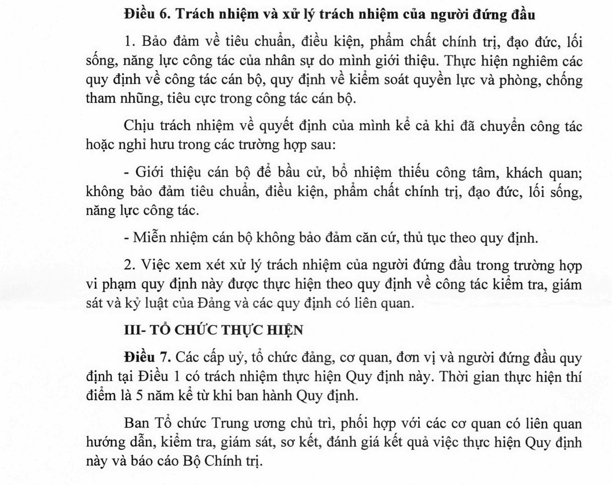2. Việc xem xét xử lý trách nhiệm của người đứng đầu trong trường hợp vi phạm quy định này được thực hiện theo quy định về công tác kiểm tra, giám sát và kỷ luật của Đảng và các quy định có liên quan”.