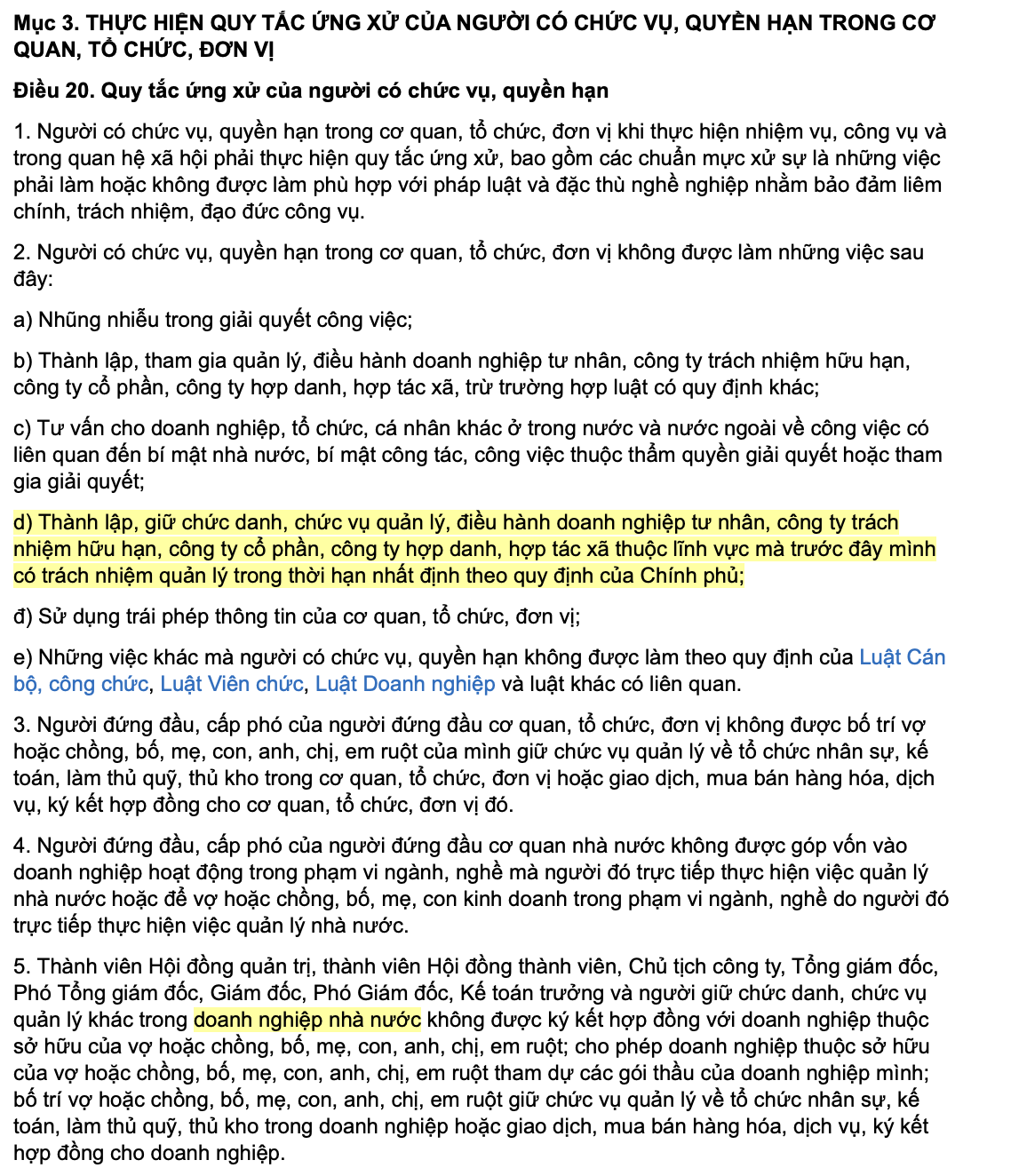 Luật phòng chống tham nhũng quy định, cán bộ, công chức không được tham gia quản lý doanh nghiệp