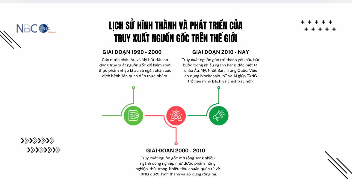 Giai đoạn 2010 - nay: Truy xuất nguồn gốc trở thành yêu cầu bắt buộc trong nhiều ngành hàng, đặc biệt tại châu Âu, Mỹ, Nhật Bản, Trung Quốc. Việc áp dụng blockchain, IoT và AI giúp TXNG trở nên minh bạch và chính xác hơn.