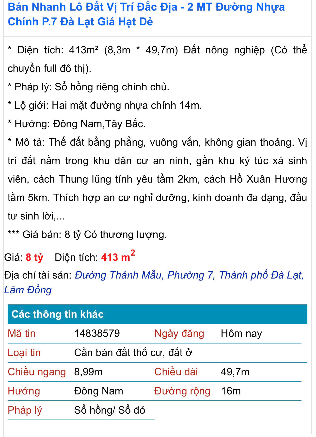 Hiện tại giá đất tại phường 7 thành phố Đà Lạt, tỉnh Lâm Đồng rất cao, đặc biệt những nơi có vị trí đắc địa nằm trong thung lũng tình yêu, nhìn thẳng ra dãy Langbiang hùng vĩ. Chính vì thế, chỉ cần gõ bàn phím với những nội dung cần mua đất tại khu vực trên sẽ cho ra hàng loạt kết quả. Mới liên hệ với một “cò đất” trên mạng chúng tôi nhận được lời khẳng định như đinh đóng cột, mua đất rừng, đất nông nghiệp sẽ được bao xây dựng vì đã có “bảo kê” là những người có thế lực.