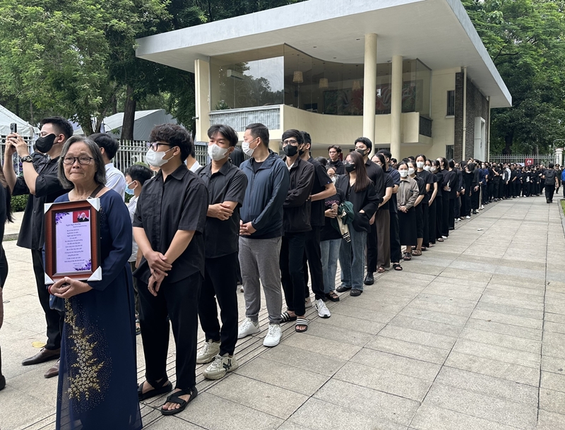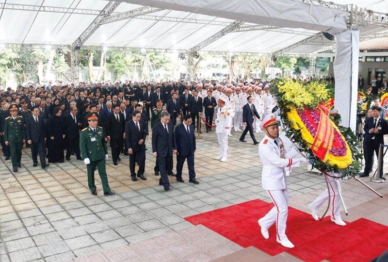 Trong niềm xúc động, tiếc thương sâu sắc, từ sáng sớm, các Đoàn đại biểu Đảng, Nhà nước, Quốc hội, Chính phủ, Mặt trận Tổ quốc Việt Nam, các bộ, ban, ngành, cán bộ, chiến sĩ các lực lượng vũ trang cùng đông đảo tầng lớp nhân dân Thủ đô và nhiều tỉnh, thành phố trong cả nước đã tập trung tại khu vực Nhà Tang lễ Quốc gia, số 5 Trần Thánh Tông (TP Hà Nội) dự Lễ viếng Tổng Bí thư Nguyễn Phú Trọng - Nhà lãnh đạo đã có nhiều công lao to lớn, đặc biệt xuất sắc đối với sự nghiệp cách mạng vẻ vang của Đảng và dân tộc.