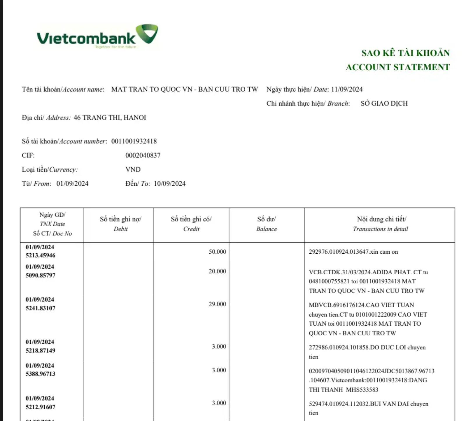Để bảo đảm tính minh bạch, Mặt trận Tổ quốc Việt Nam đã công khai sao kê tài khoản Vietcombank 0011001932418 từ ngày 1/9 đến 10/9/2024; thể hiện minh bạch việc ủng hộ đồng bào bị ảnh hưởng bởi cơn bão số 3.