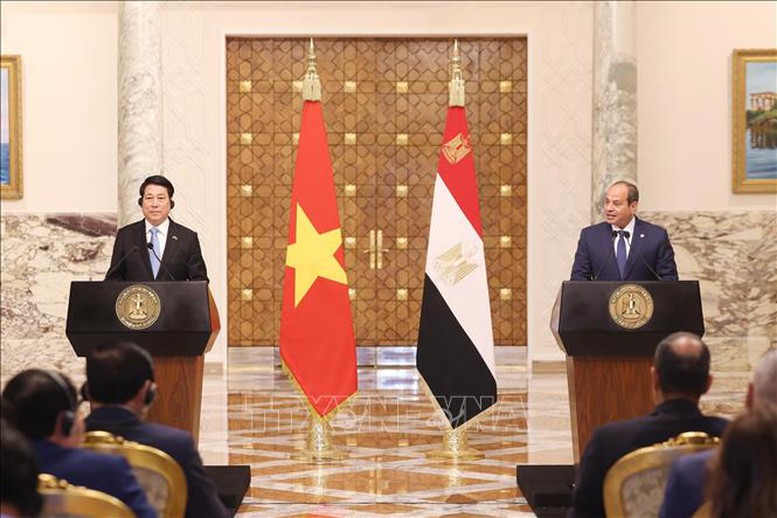 Chủ tịch nước Lương Cường và Tổng thống Ai Cập Abdel Fattah El-Sisi gặp gỡ báo chí, thông tin về kết quả hội đàm. Ảnh: TTXVN