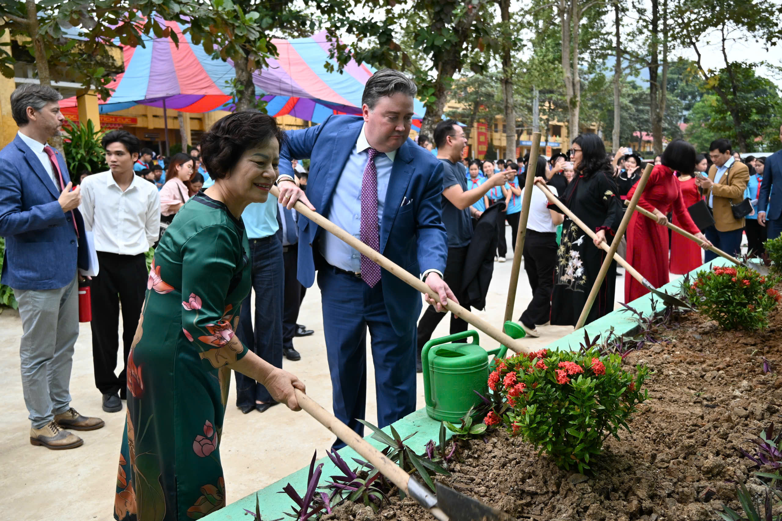 Đại sứ Mỹ Marc Knapper trồng cây tại Thư viện mới của trường THCS Tân Trào.