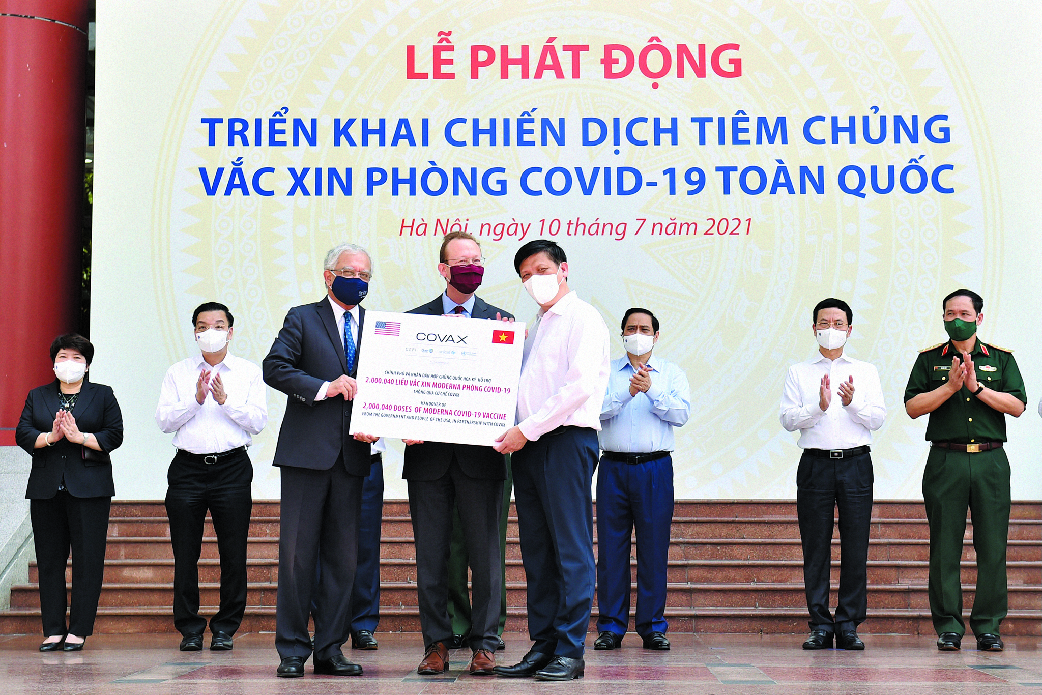 Bộ trưởng Bộ Y tế Nguyễn Thanh Long (phải) cùng đại diện lãnh đạo các bộ, ban, ngành dự buổi lễ tiếp nhận 02 triệu liều vaccine Moderna của Chính phủ Hoa Kỳ hỗ trợ