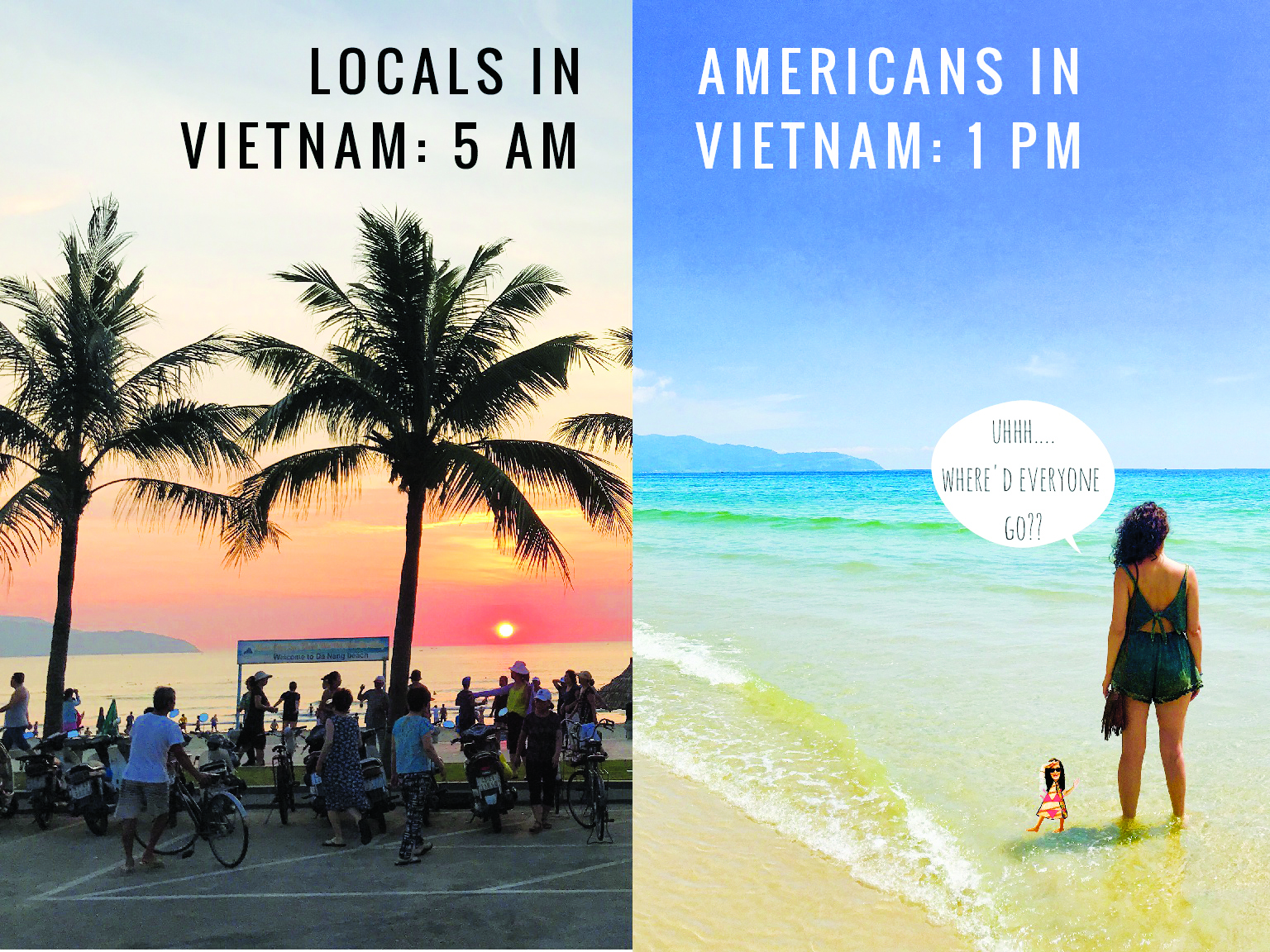 Hoá ra là với người Việt giữa trưa là thời điểm tệ nhất để ra bãi biển. Không ai ở Việt Nam đi tắm biển vào giữa trưa cả. Ở đây, lý tưởng nhất để ra biển chơi là 5 giờ sáng, khi mặt trời mới mọc. Bạn sẽ thấy một bãi biển chật ních những người tập thể dục, lớp nhảy Zumba của các bà các cô, những trận bóng chuyền bãi biển hay chạy bộ, nhảy aerobic... Một thời điểm yêu thích khác của người Việt là lúc 5 giờ chiều. Bãi biển cũng sẽ đông đúc các cặp vợ chồng và con nhỏ, những người bơi nhẹ nhàng ở các vùng nước nông hay nằm tắm nắng trên bờ cát khi mà mặt trời đang từ từ lặn xuống.