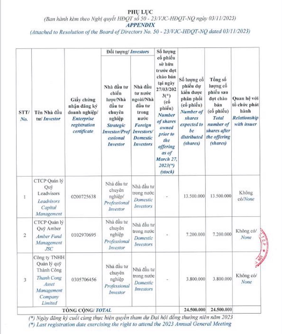 Hơn một tháng trước, Vietjet thông báo chào bán 24,5 triệu cổ phiếu riêng lẻ với giá chào bán là 100.000 đồng/cổ phiếu cho 3 quỹ đầu tư trong nước, dự tính thực hiện ngay trong quý 4/2023 để thu về hơn 2.450 tỷ đồng.