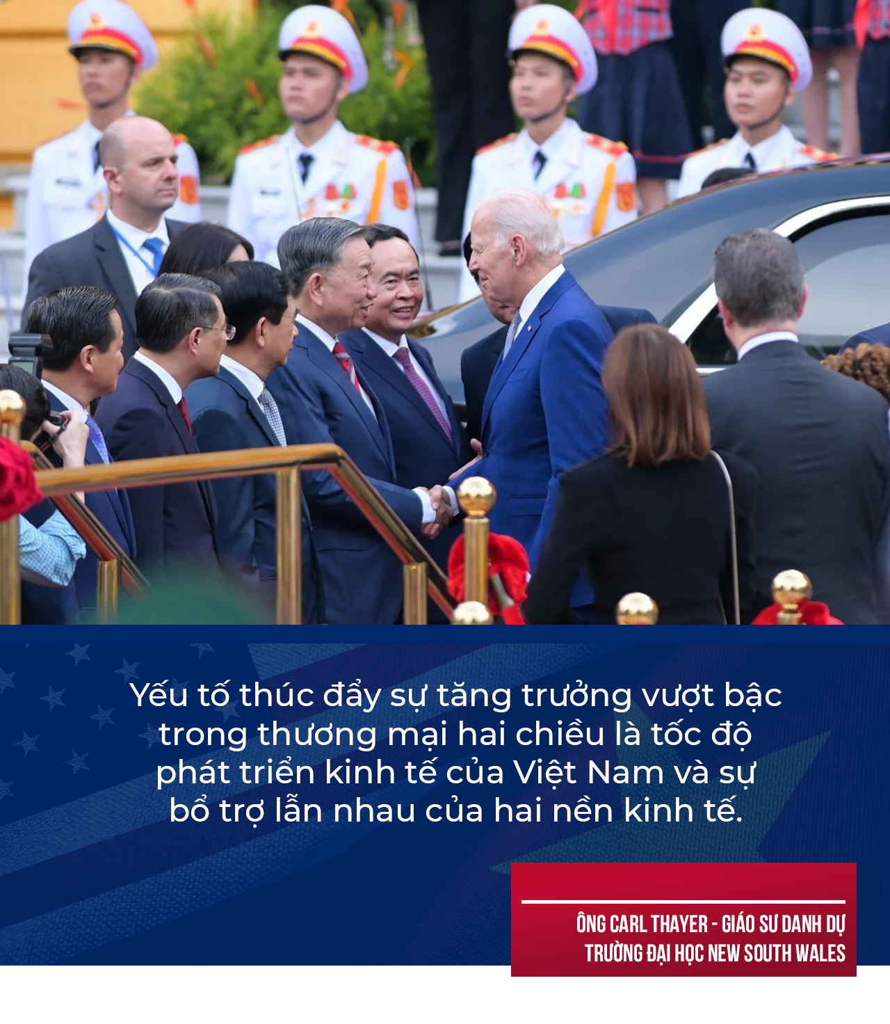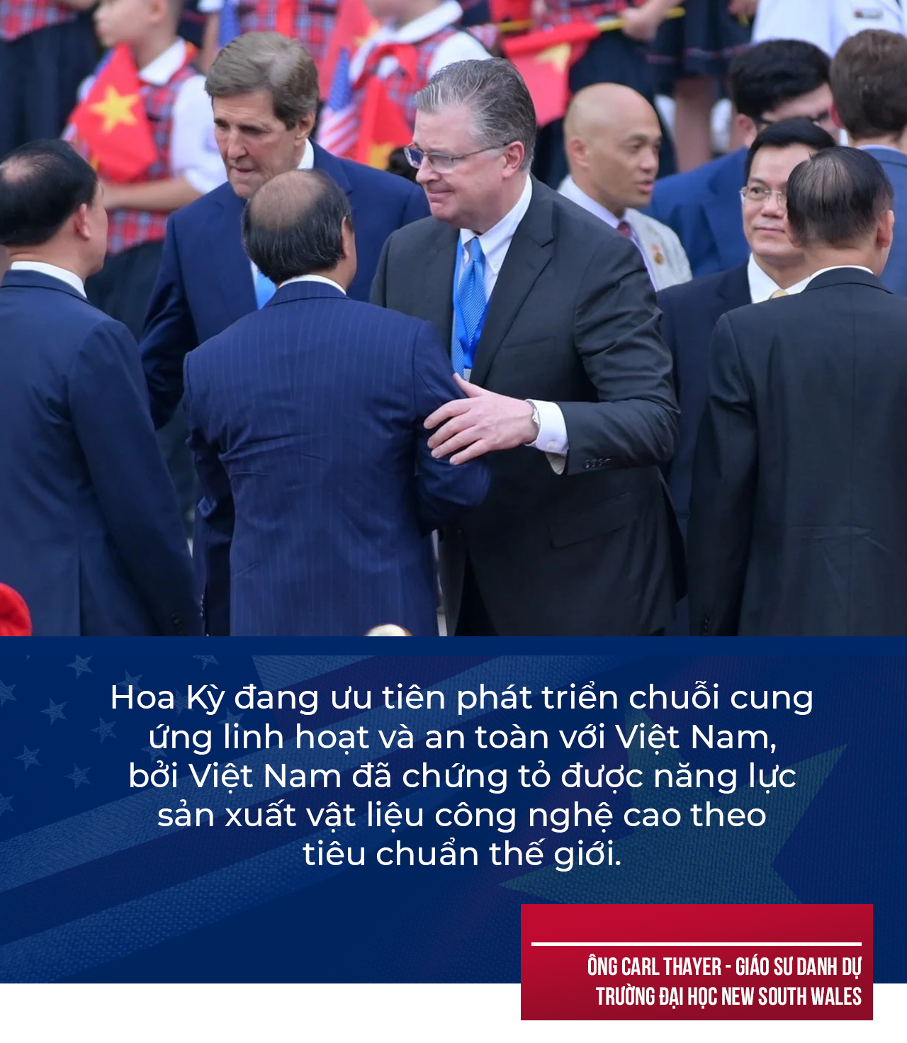 Nhận định về tiềm năng hợp tác kinh tế - công nghệ giữa hai nước trong thời gian tới, ông Thayer cho rằng, chuyến thăm lịch sử của Tổng thống Joe Biden và sự kiện nâng cấp quan hệ Việt-Mỹ lên mức "Đối tác Chiến lược Toàn diện" sẽ tạo cơ hội chưa từng có để thúc đẩy những lĩnh vực hợp tác mới, tạo nền tảng mạnh mẽ để Việt Nam thực sự có mặt trong các chuỗi giá trị toàn cầu.
