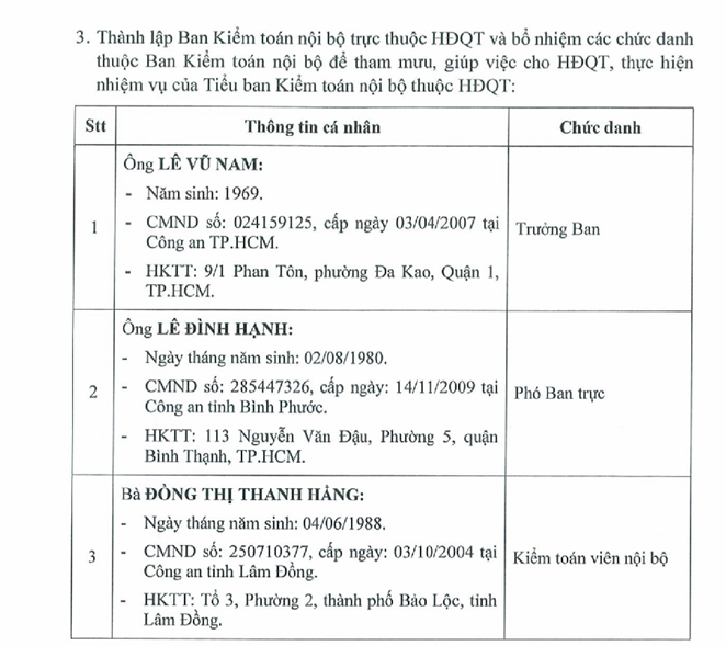 Hoặc Nghị quyết số 04A/NQ/HDQT/2018 bổ nhiệm nhân sự cấp cao thuộc Ban Điều hành và các chức danh đơn vị trực thuộc Hội đồng Quản trị cho thấy việc Thành lập Ban Kiểm toán nội bộ trực thuộc Hội đồng Quản trị và bổ nhiệm các chức danh thuộc Ban kiểm toán nội bộ để tham mưu, giúp việc cho Hội đồng Quản trị….với ông L.V.N giữ chức Trưởng ban.