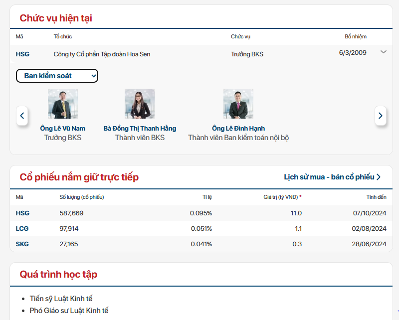 Cụ thể, giai đoạn 2010 – 2017, ông N khi đó đang là Trường khoa Luật Trường Đại học Kinh tế - Luật giữ chức vụ Trưởng ban Kiểm soát thuộc Công ty Hoa Sen; giai đoạn 2019-2024 ông N được bổ nhiệm Phó Hiệu trưởng Trường Đại học Kinh tế - Luật (UEL) đồng thời giữ chức vụ Trưởng ban Hỗ trợ Kiểm toán tại Công ty Hoa Sen; giai đoạn 2024 đến nay Phó Giáo sự L.V.N được tái bổ nhiệm Phó Hiệu trưởng Trường Đại học Kinh tế - Luật (UEL) đồng thời giữ chức vụ Trưởng ban Hỗ trợ Kiểm toán tại Công ty Hoa Sen.