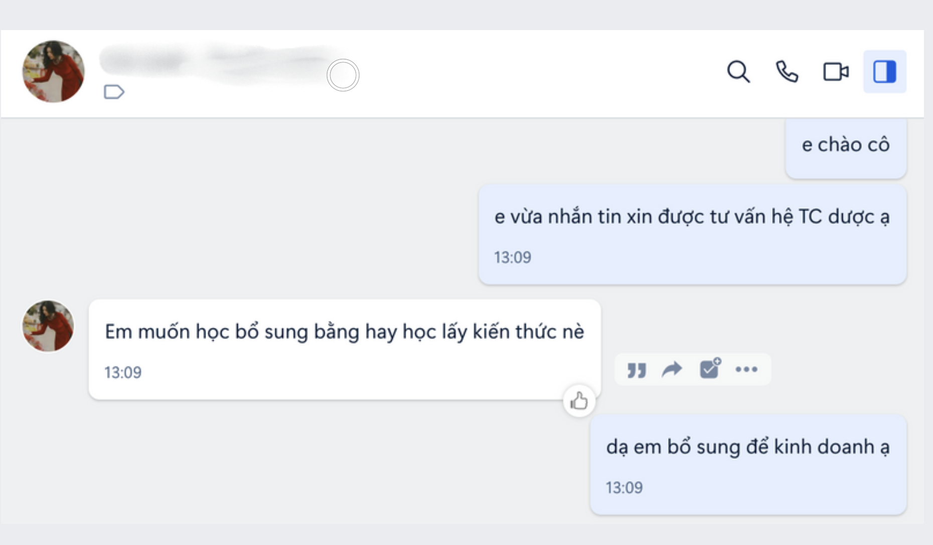Cụ thể, qua tài liệu của một học viên cho thấy, người này có liên lạc với một người tên L. là nhân viên tuyển sinh của Học viện Giáo dục ILEARNING. Khi đề cập việc muốn tìm hiểu ngành Dược trung cấp, L. đã hỏi luôn: “Bạn muốn học bổ sung bằng hay học để lấy kiến thức”.