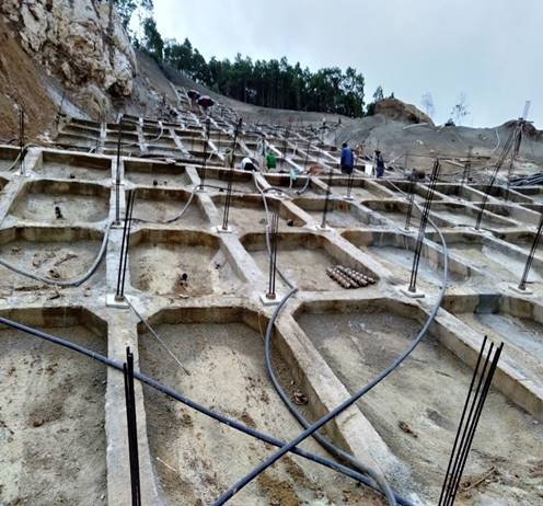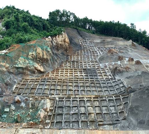 Ứng dụng thực tế tại Km27+950 (bên trái tuyến) – Cao tốc Hạ Long – Vân Đồn (tỉnh Quảng Ninh), đây là vị trí có địa hình, địa chất phức tạp, việc bảo vệ mái taluy đào gặp rất nhiều khó khăn. Cụ thể, trước thời điểm AVT Việt Nam đảm nhận công việc gia cố, mặc dù được áp dụng nhiều biện pháp, vị trí này vẫn xảy ra sạt trượt. Để đảm bảo hiệu quả cao nhất trong công tác xử lý ổn định bề mặt mái taluy, ATV Việt Nam áp dụng công nghệ neo trong đất kết hợp khung dầm bê tông, tường chắn bê tông cốt thép và lưới chắn đá rơi.