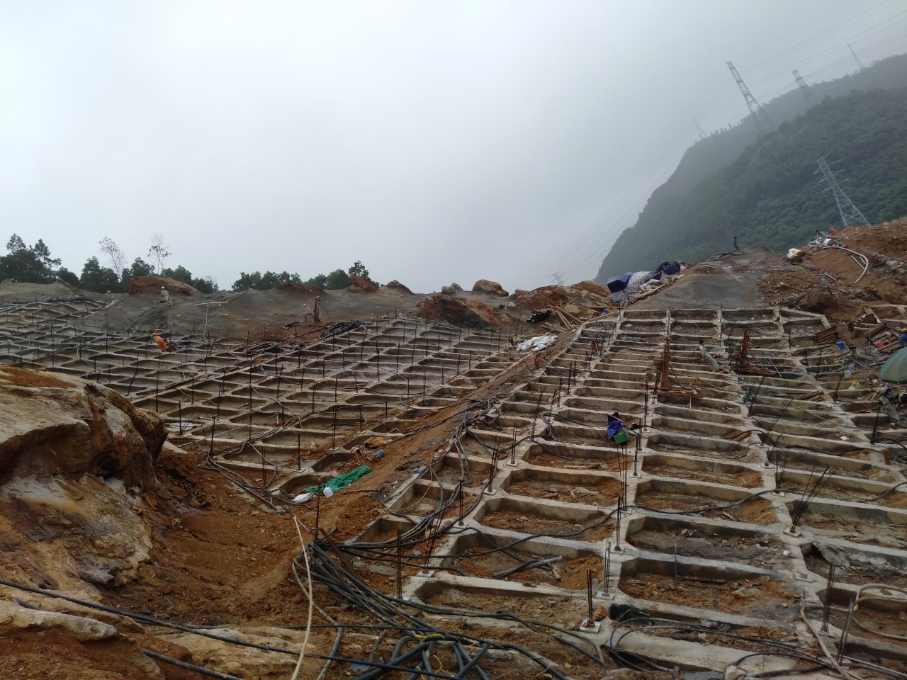 - Đinh đất chiều dài L=6m, đường kính khoan D91mm, Khung dầm BTCT kích thước 20x20cm, khoảng cách 2x2m, bê tông phun phủ kết hợp lưới thép dày 7cm;